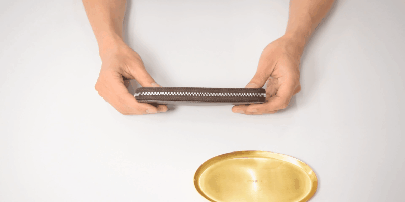 dulang fitは、横幅16.4㎝縦9㎝厚み2㎝の、超コンパクトサイズの長財布。横16,4㎝は、1万円札(16㎝)がちょうど入るサイズ感。縦9㎝は、カードが縦に入り、ファスナー開閉に余裕のあるギリギリの高さ。使いやすさを損ねず最小を目指した。